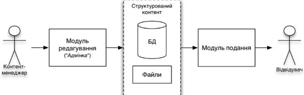 Керування контентом веб-сайтів охоплює не тільки фізичні процеси розміщення веб-сторінок в інтернеті. Сучасне керування контентом вимагає розглядати контент як об’єкт моделювання, структурування і формалізації для організації його ефективного зберігання, публікації та подання кінцевим споживачам у зручному вигляді із зручними інтелектуалізованими засобами навігації. У зв’язку із значущою роллю керування контентом, першочергова увага розробників